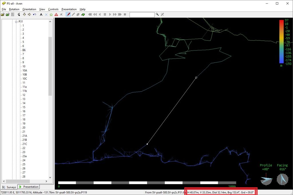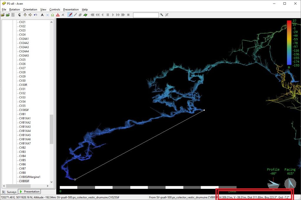 Desi Loch si Aven sunt similare, fiecare are niste puncte forte in vizualizarea si analiza modelelor 3D. Intre functiile deosebite de la Aven sunt posibilitatea a masura distanta dintre doua puncte(punctele pot fi vize sau capete de radieri) si alti parametri. Se poate masura distanta 3D/in spatiu, distanta proiectiei orizontale si cea verticala (diferenta de nivel), unghiul vertical facut de segmentul definit de cele doua puncte si unghiul orizontal (azimutul).