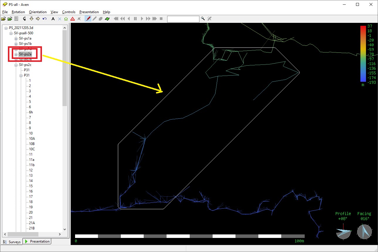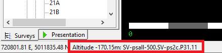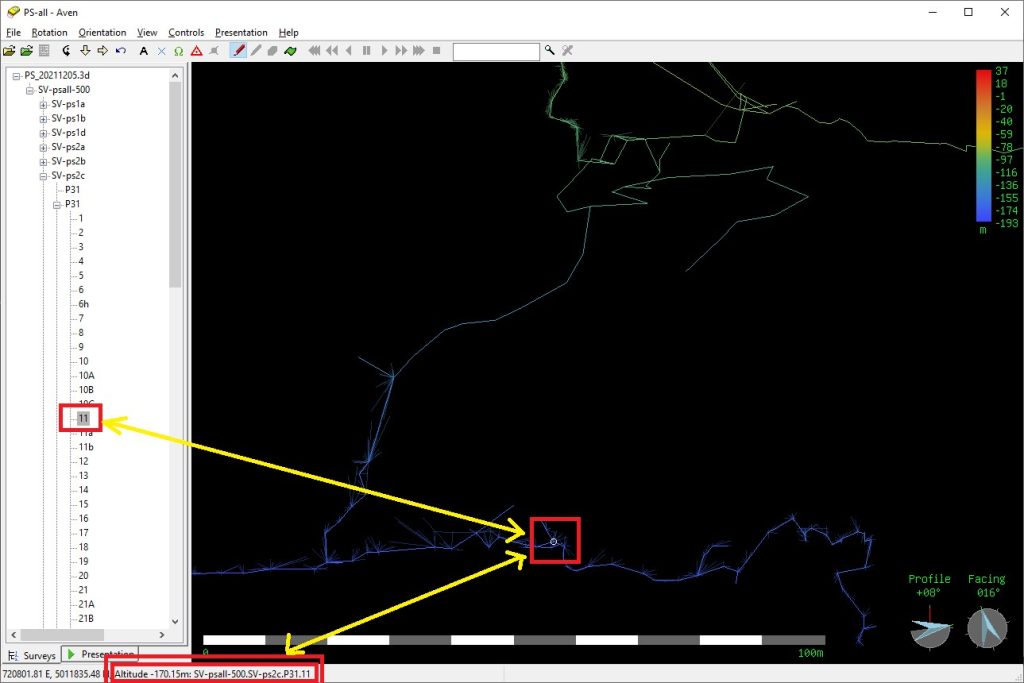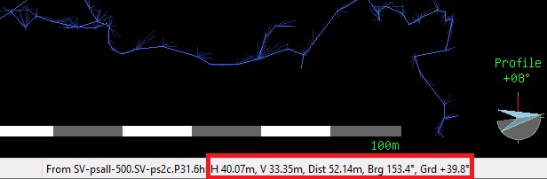 Prin plasarea cursorului pe o viza, va fi afisata in stanga jos numele vizei(statiei) si topografia de care apartine si adancimea in pestera (destul de util pentru ca in Loch este destul de greu de identificat o viza in modelul 3D). In lista din stanga modelului, prin plasarea cursorului peste intrarile din lista, pot fi identificate usor zonele cu topografii (apare un chenar in jurul lor) sau vizele (apar cu un cerc in modelul 3D).