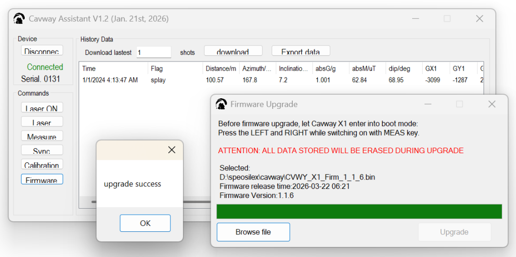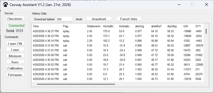 Pe site-ul CaveDevice, producătorul pune la dispoziție aplicația Cavway Assistant pentru PC (v1.2 în ian. 2026), utilizată pentru update de firmware, descărcarea istoricului de măsuratorilor și administrarea coeficienților de calibrare. Funcțiile de bază de calibrare și actualizare firmware pot fi accesate și prin TopoDroid. În istoricul măsurătorilor se găsesc datele RAW ale celor 2 seturi de senzori.
